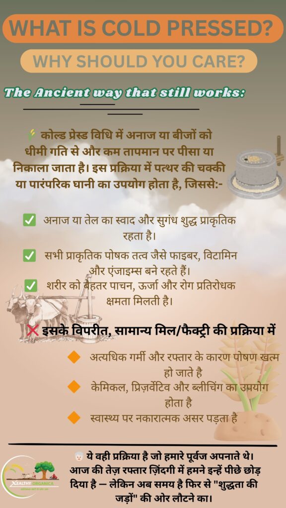 For oils, seeds are slowly pressed at low temperatures using wooden or traditional ghani.