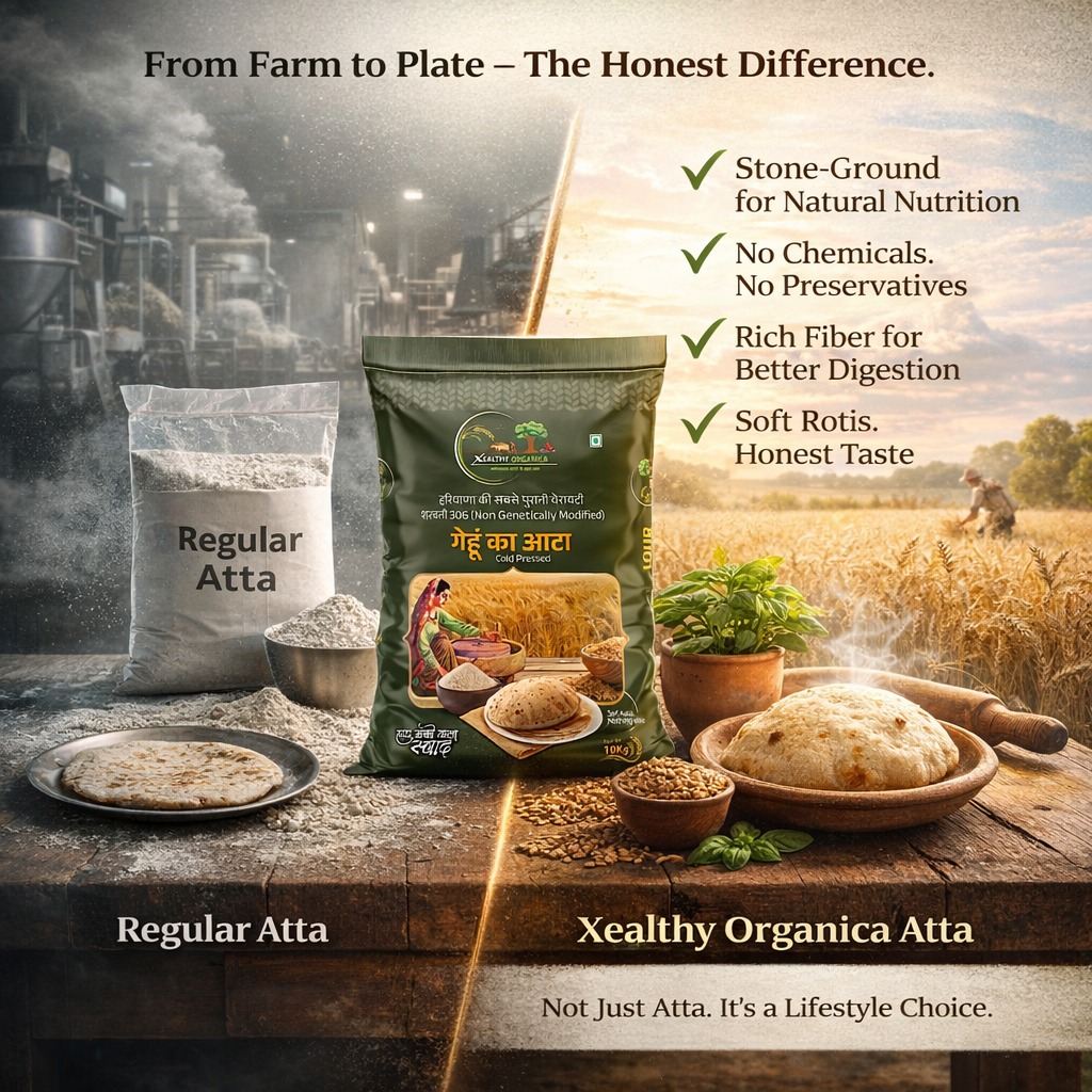 Xealthy Organica prepares atta using traditional stone grinding methods in small batches without preservatives or chemical additives. The focus is on maintaining freshness, preserving natural fiber (choker), and delivering flour closer to its original grain form. We follow a Same‑Day Milling, Same‑Day Dispatch policy to ensure you always receive Atta that is freshly prepared. You may also Visit our site to experience the authenticity. Atta – Xealthyorganica . Follow our Instagram Page or FB Page for more informational content.